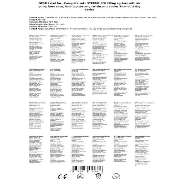 Komplett set – Öltapp STREAM 80K med luftpump, ölväska, genomströmningskylare, 2-linjers torrkylare Består av: •STREAM 80K med luftpump, ölväska, genomströmningskylare, 2-linjers torrkylare•2x tryckluftsslang komplett John Guest 5/16 till 3/4 skruva på för att skruva på dispenseringshuvudena•2x ölslang komplett John Guest 3/8 till 5/8 skruva på för att skruva på kranhuvudena•2x kranhuvuden efter eget val (utan kranhuvuden, 5 liters adapter, platt, kombi, Köpi, triangulär, korg)•Anslutningar: John Guest Öltapp STREAM 80K med luftpump, ölväska, genomströmningskylare, 2-linjers torrkylare Öltapp STREAM 80K med luftpump, ölväska, genomströmningskylare, 2-linjers torrkylare 3 minuter att packa upp… 2 minuter att montera… 1 minut att ansluta = oändlig njutning.En kall, klar, nyutkastad – du förtjänar det!Ölkylaren STREAM 80K 2lt är avsedd för professionell kylning och utskänkningav utmärkt kyld öl i hemmamiljö, på trädgårdsfesteroch för medelstora kommersiella användningsområden. •Reglerområde+2 till +10 grader•Effekt:90 liter/timme vid 10°C TD•Kylteknologiär 45% mer effektiv•Klar att användapå bara 5-10 minuter När termostaten är inställd på Max,kommer termoblocket (efter ca 10 minuter) att ackumulera en hög mängdenergi och möjliggöra därmed en utskänkning avflera kylda öl i följd.Kylteknologin i STREAM 80K Öltapp är cirka 45% mer effektiv än den elektriska effektförbrukningen.Ölet kyls ned till tappkranen.Kylöglorna är tillverkade av rostfritt stål och är därför stabila och hållbara. De använda materialen uppfyller de högsta hygienstandarderna och möjliggör lång livslängd för kylaren. STREAM 80K 2lt – och den kalla ölen strömmar från 2 kranar Med sin starka kyleffekt och perfekta dimensioner är Öltapp STREAM 80K en av de ledande 2-linjers bord-/underbänkskylarna på marknaden. Kyleffekt på 170 till 180 glas (0,5 liter) utmärkt kylt öl per timme, Den kraftfulla kompressorn STREAM 80K säkerställer minimal energiförbrukning och utmärkt kylt öl utan skumning Genomlopps-/torrkylare STREAM 80K 2ltg. – Effektivitet, Effekt, Njutning Termoblocket i STREAM 80K ölzapfanläggning har hög energikapacitet, vilket gör att perfekt kyld öl kan tappas redan efter 5-10 minuter. När termostaten är inställd på Max, kommer termoblocket (efter ca 10 minuter) att ackumulera en hög mängd energi och möjliggöra därmed en utskänkning av flera kylda öl i följd. Kylteknologin i STREAM 80K Öltapp är cirka 45% mer effektiv än den elektriska effektförbrukningen. Ölet kyls ned till tappkranen. Kylöglorna är tillverkade av rostfritt stål och är därför stabila och hållbara. De använda materialen uppfyller de högsta hygienstandarderna och möjliggör lång livslängd för kylaren. Genomlopps-/torrkylare STREAM 80K – Tekniska Data Den ädla STREAM 80K Torrkylaren med en vikt på endast 45 kg är utrustad med ett 7 mm rör. •Mått: (BxDxH) 255x635x510 mm (inkl. droppskål)•Strömförsörjning: 220V, 50 Hz, 804W, 4,5A•Kompressor: 3/8 PS•Rörledning: 2 sorters öl•Hölje: Metall, pulverlackerad, rostskydd Hög kvalitet på utförande och förpackning STREAM 80K – Bäst i klassen för 2-linjers Öltapp Ölkylaren STREAM 80K är i kategorin Öltapp upp till 90 liter/timme, en av de bästa när det gäller kostnads-, prestanda- och kvalitetsförhållandet. Enkel rengöring av STREAM 80K Med följande rengöringsset kan du enkelt och bekvämt rengöra din STREAM 80K Öltapp efter användning: Rengöringsset litet Lättrengöringsset (rekommenderas) Städningsset stort Öltapp STREAM 80K – 2 linjer, upp till 90 liter/timme Med bara några enkla steg kan du tappa: Packa upp Öltapp Anslut tryckregulatorn till CO2-flaskan med koldioxidnyckeln och dra åt Anslut CO2-slangen från tryckregulatorn till tapphuvudet Anslut ölslangen till tapphuvudet, sätt in den i zapfanläggningen och fixera den Anslut öltunnan Ställ in trycket på tryckregulatorn Anslut zapfanläggningen till eluttaget Ställ in trycket och njut av kall öl