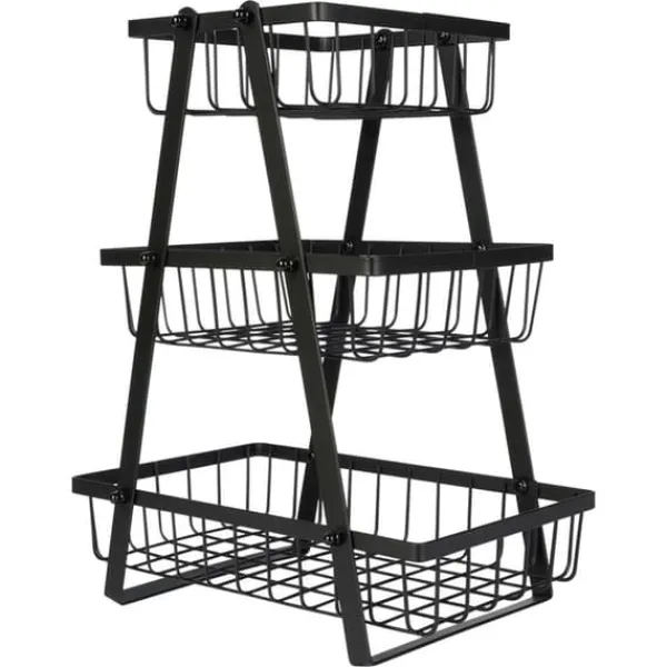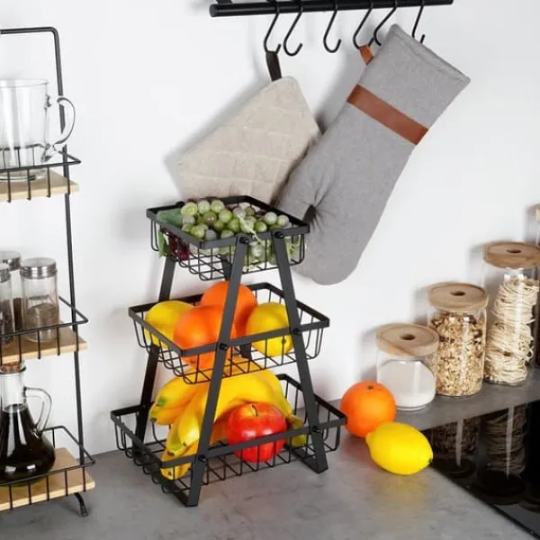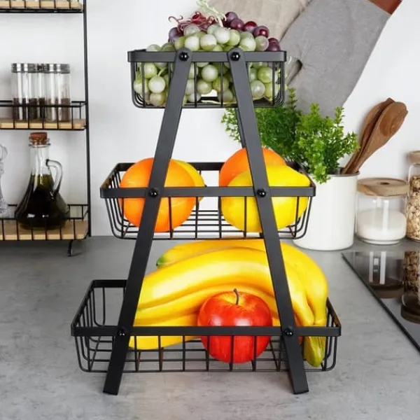 Frukt- och grönsakskorg i tre nivåer i loftstil. Tillverkad av svart metall. Lämplig för alla kök.