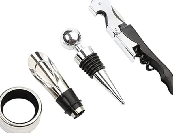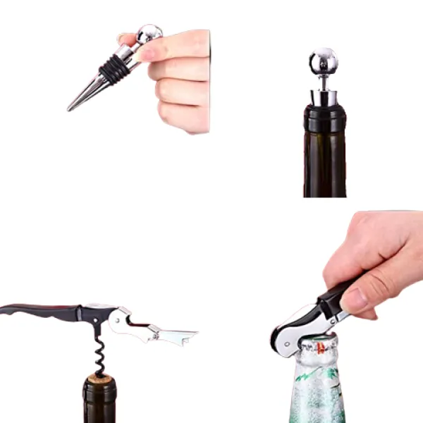 Ett välbehövligt set om du har gäster. Sjöhästkniven kan användas för att öppna vin, champagne, öl, skära aluminiumfolie, vinkorkar för att bibehålla kvaliteten. Vinringen ska förhindra att vinet rinner ut och fuktar etiketten och upphällaren är lätt att kontrollera, vilket gör vinet mer värdefullt. Vinkorkskruven är gjord av rostfritt stål, stark och hållbar och du behöver inte oroa dig för rost eller skador.