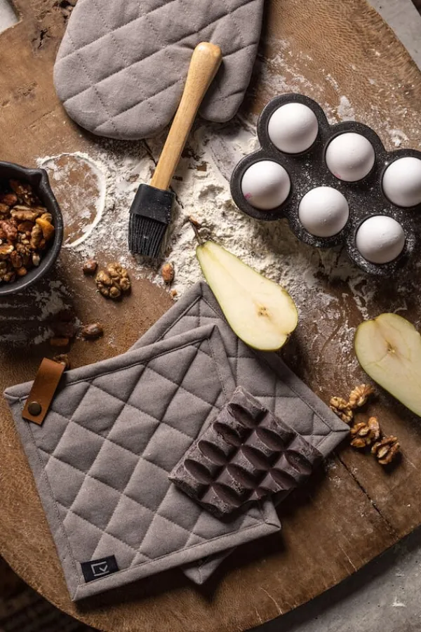 Grytlappar i 2-pack med ögla, producerad i ren bomull. Grytlapparna är quiltade, vadderade och har en snygg detalj i PU-läder.