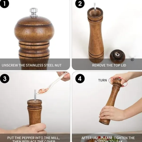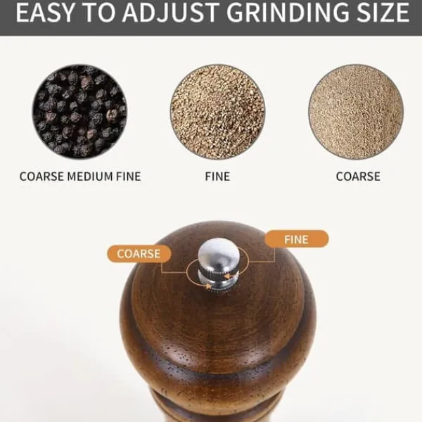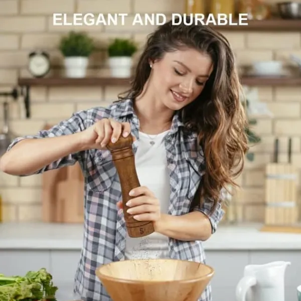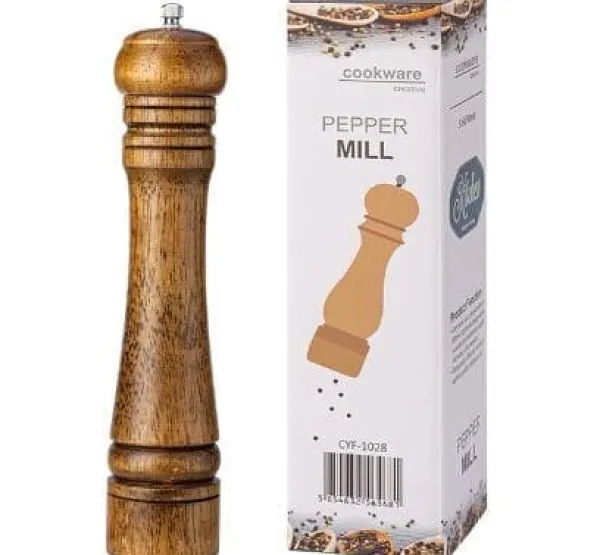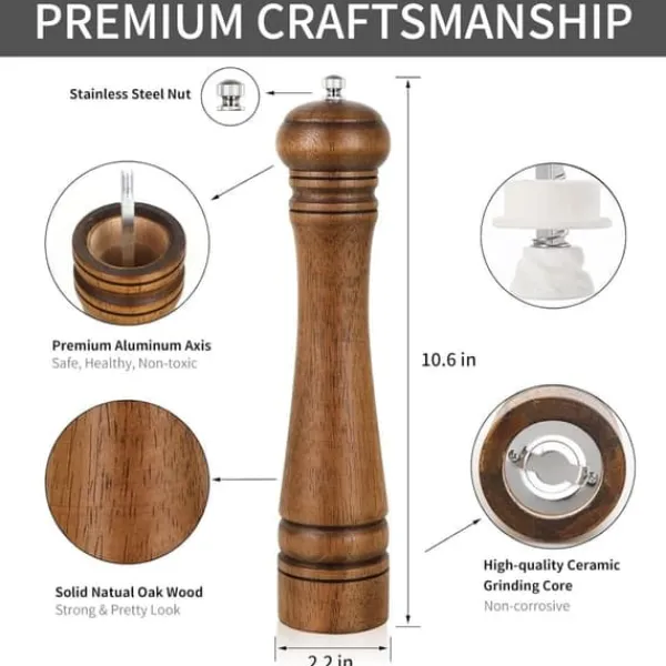 Denna 10-tums manuella pepparkvarn kombinerar klassisk design med funktionell elegans. Tillverkad av robust naturligt ekträ, ger den ett behagligt grepp och en rustik känsla i köket. Den keramiska kvarnmekanismen är hållbar, rostfri och lätt att justera för grov eller fin malning. Perfekt för att mala pepparkorn, havssalt, chiliflingor eller torkade örter. Passar både för hemmakocken och till middagsbordet.