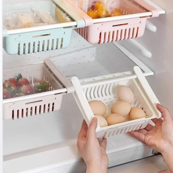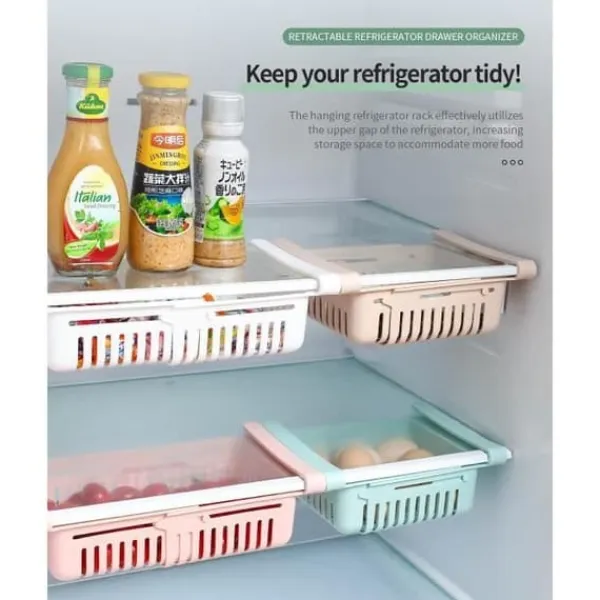 Organisera ditt kylskåp med detta paket med 4 utdragbara förvaringslådor. Finns i rosa, blått, kaki och vitt, de passar hyllor som är mindre än 0,8″. Idealiska för att hålla dina livsmedel i ordning och optimera utrymmet.