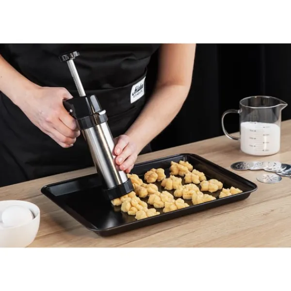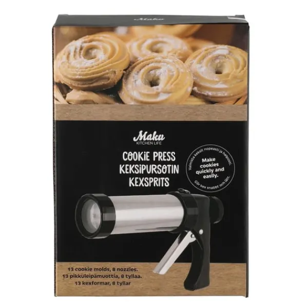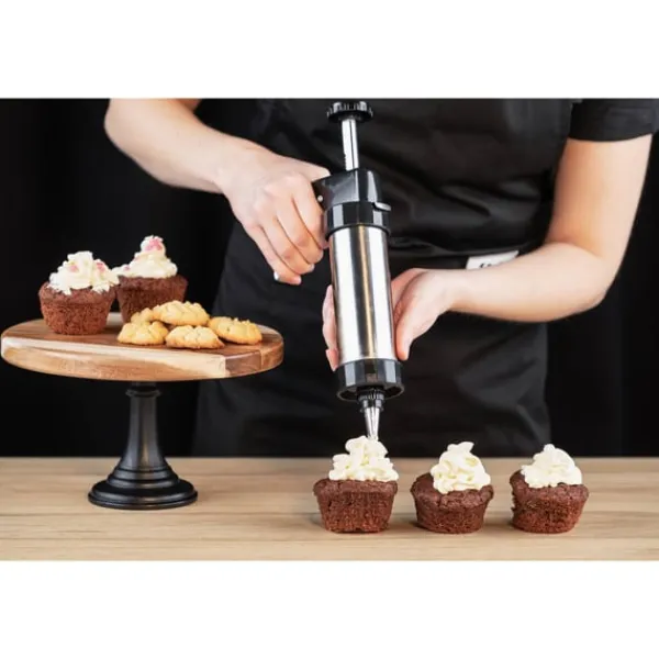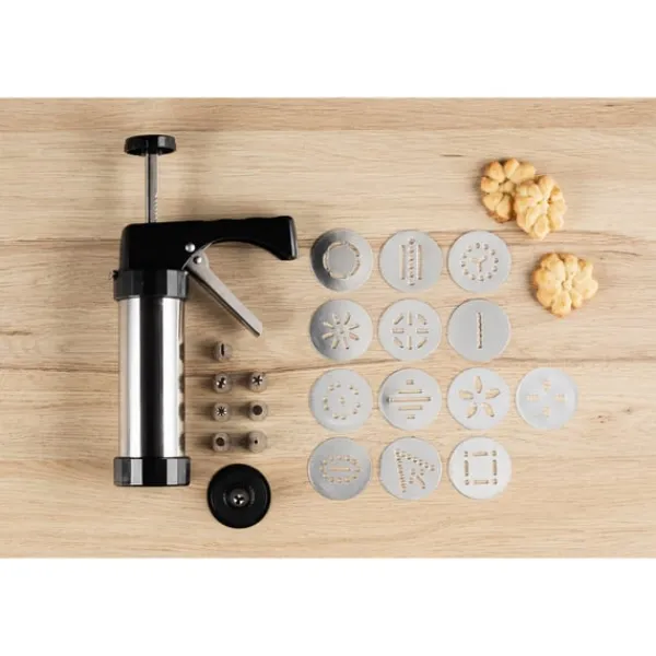 Den ergonomiska designen ger ett bekvämt grepp och gör den lätt att använda under längre perioder. Kakpressen är mångsidig, så att du kan växla mellan olika skivor och munstycken för att uppnå olika former och mönster. För bästa resultat bör du handdiska komponenterna för att bibehålla deras kvalitet och livslängd.