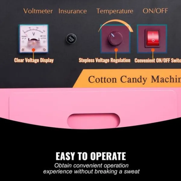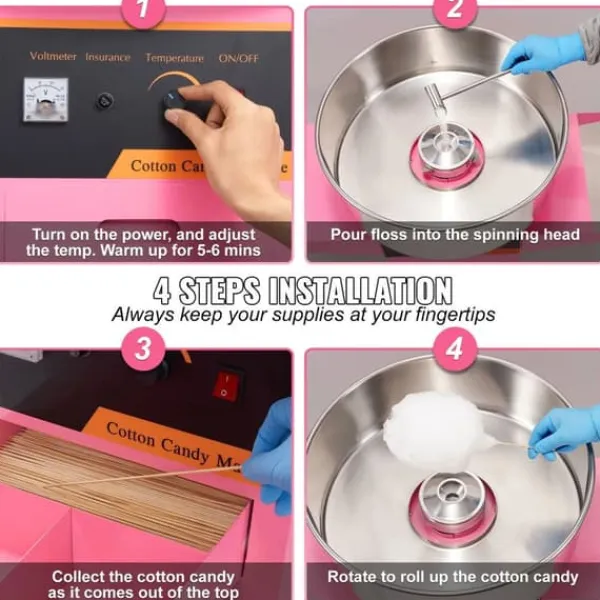 -Lätt att använda process: Att använda den här maskinen kunde inte vara enklare. Slå på strömmen, justera temperaturen, förvärm i 5-6 minuter, häll sockret i snurrhuvudet och använd en pinne för att samla upp marshmallows från snurrhuvudet.