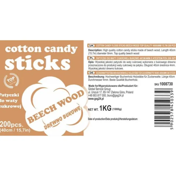 Högkvalitativa sockervaddsstavar av bokträ, avsedda för tillverkning av sockervadd på pinne.