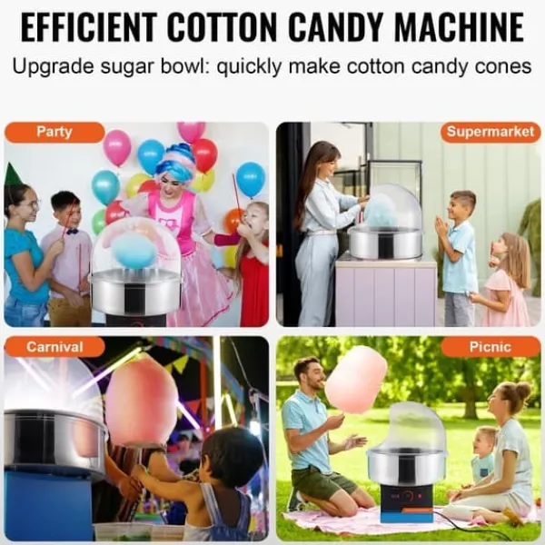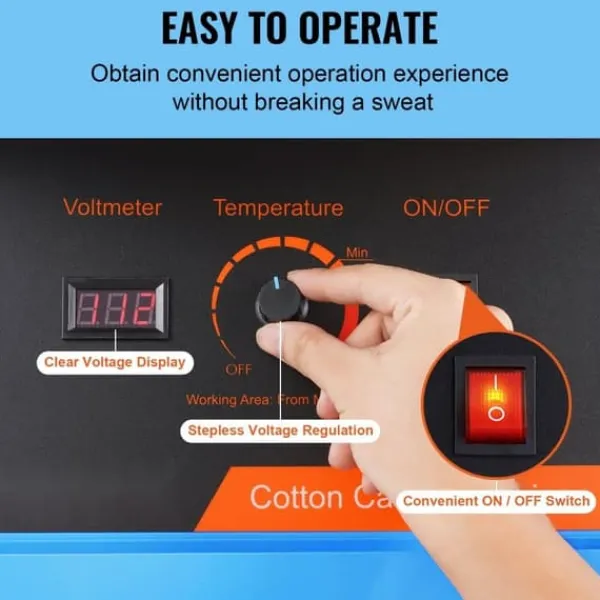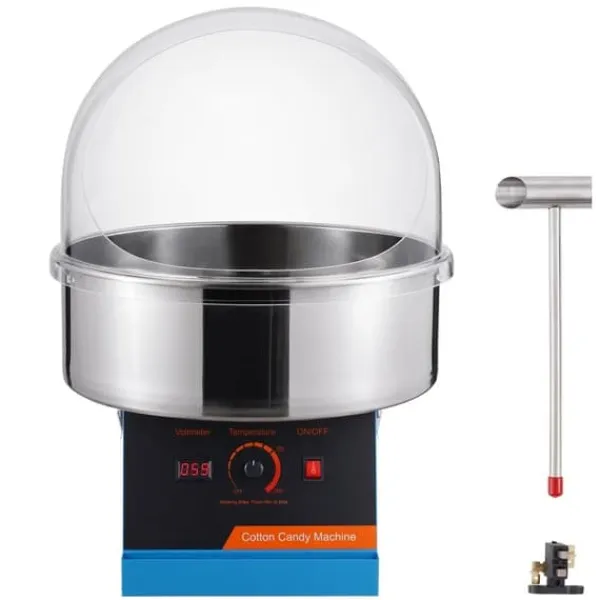 Denna elektriska godisflossmaskin skiljer sig från vanliga maskiner genom att den har en spänningsmätare och en ratt för temperaturkontroll. Genom att justera spänningen kan du enkelt reglera temperaturen mellan 244,9°F/118,3℃ och 439,2°F/226,2℃, vilket är perfekt för att experimentera med olika sockerarter och smaker.