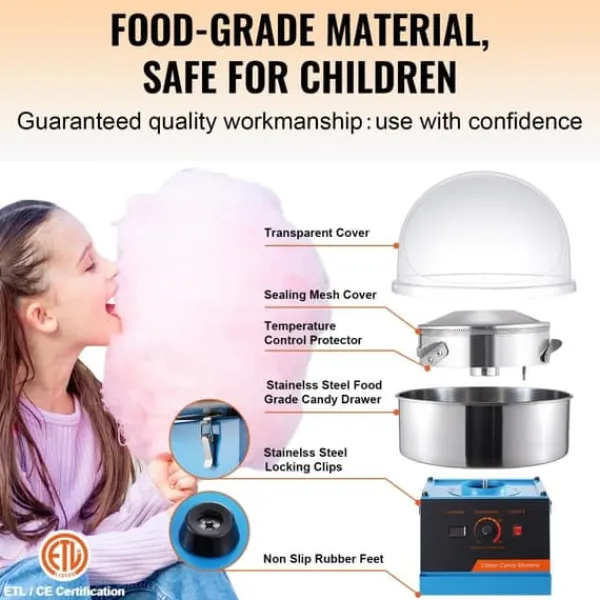Maskinen har en praktisk sockersked för enkel hantering av sockret och tätningskomponenter som förhindrar att sockerfall hamnar i maskinens interna delar. Med ETL/CE-certifiering förbättras säkerheten, och det genomskinliga locket förhindrar främmande föremål från att komma in i sockervadden.