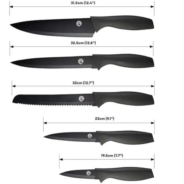 Detta Mästerkocken knivset från den populära tv-serien Mästerkocken är det perfekta valet för både amatörer och professionella hemmakockar. Tillverkat av högkvalitativt rostfritt stål med svarta handtag och blad som ger detta knivset en proffsig look samtidigt som det är snygga i köket. Varje kniv har ett ergonomiskt handtag för ett säkert och bekvämt grepp. Knivarna har en non-stick-beläggning som underlättar skärningen.