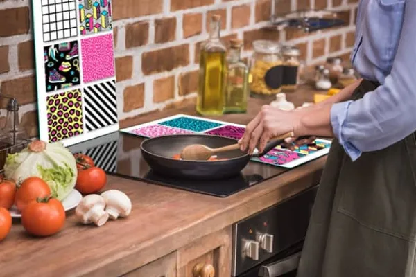 vid matlagning för elektriska, keramiska och gasspisar. När det gäller gasspisar rekommenderar vi att man ägnar särskild uppmärksamhet åt användningen. Om hällen bara lutar mot väggen, håll ett säkerhetsavstånd på 15 cm från brännaren. Plattan kan limmas fast på väggen med hjälp av speciell skumtejp (finns i vår butik) då kan avståndet från brännaren vara mindre . När du lagar mat bör du inte trycka kastruller etc. mot glas med grafik. ✅Skärbräda