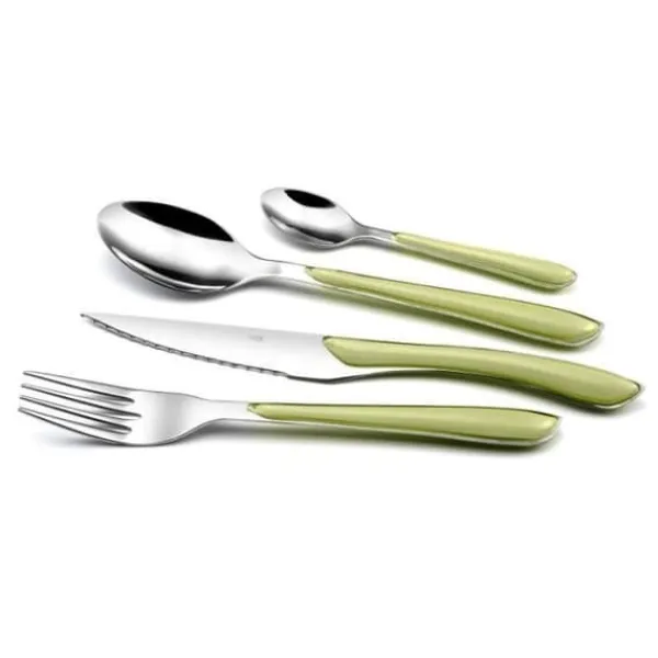 Set med 24 bestick för 6 personer från Eclat Pastel-serien som levereras i en väska. Handtag i ABS i pastellgrön färg. Rostfritt stål, mikrosågad blad och blank finish. Modern och elegant, Eclat Pastel-serien lyser upp ditt bord med sin subtila och raffinerade pastellfärg. Sedan 1931 har Amefa-gruppen utvecklat sin expertis inom bordsdekoration. Amefa-serien samlar ett unikt urval av bestick, knivar och bordsaccessoarer som uppfyller mångfalden av sina kunders krav.