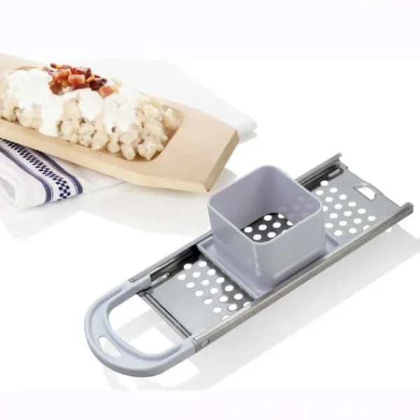 Gnocchi rivjärn. En praktisk puré, tack vare vilken vi också kan förbereda hemgjorda potatisdumplings eller mjöl- och äggdumplings. Dumplingssil/sil av rostfritt stål och plast. Hemgjorda potatisdumplings, både de gjorda av mjöl och ägg, är det bästa tillskottet till soppor och kål. Gnidytan är 23 cm lång och hålet är 8 mm i diameter. Den är gjord av material som är säkra för hälsan och neutrala för mat. Originalprodukt från det tjeckiska märket Orion.