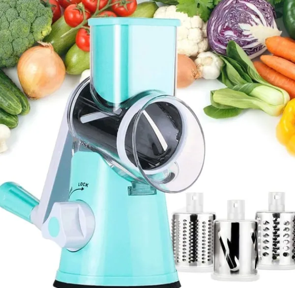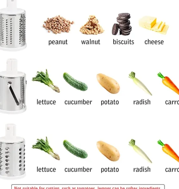 Enkelt och praktiskt: Roteras enkelt för hand och levereras med tre olika trummor för att hacka, riva och skiva ost, grönsaker, nötter osv. på olika sätt.