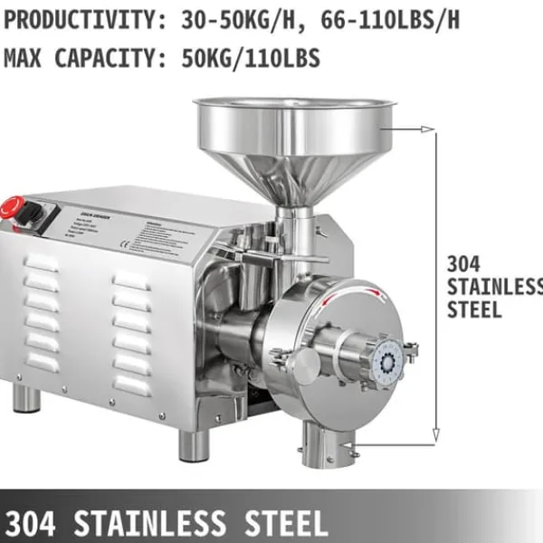 -Fullkoppartrådsmotor: helkoppartrådsmotor korn- och kryddkvarn, effekt: 2200W, motorhastighet: 1500r/min. Stark kraft och höghastighetsmotorer säkerställer hög produktivitet. Det finns många ventilationshål på den elektriska kvarnen för värmeavledning, för att säkerställa en lång livslängd på motorn.