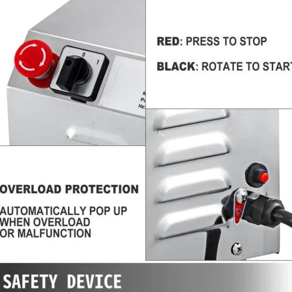 -Överbelastningsskydd: Överbelastningsskyddet för den kommersiella örtkvarnen kommer automatiskt att dyka upp när kvarnen är överbelastad, vilket skyddar motorn från skador. Lätt att använda: Vrid på den svarta knappen för att starta maskinen, tryck på den röda knappen för att stoppa maskinen.