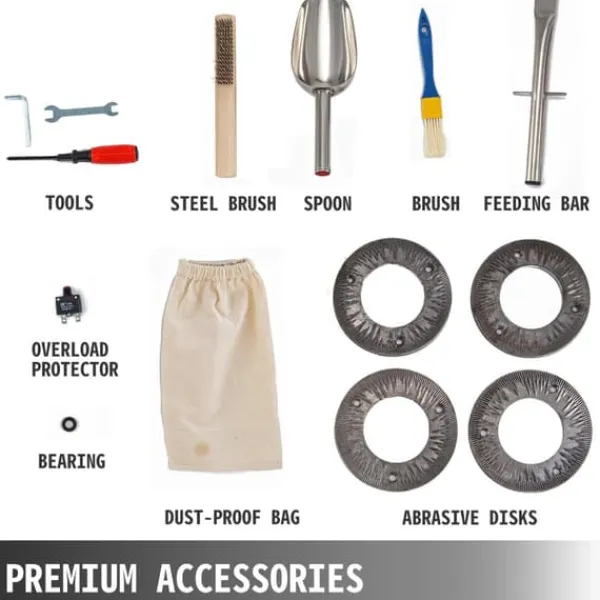 -Flera tillbehör: Den elektriska spannmålskvarnsatsen innehåller även en dammpåse, en matarstav, en borste, en stålborste, en sked, ett extra överbelastningsskydd, ett lager, fyra slipskivor och några verktyg. Allt du behöver finns här. Idealisk för att mala sojabönor, majs, kryddor, örter, kaffebönor, ris och andra torra spannmål till torrt pulver.