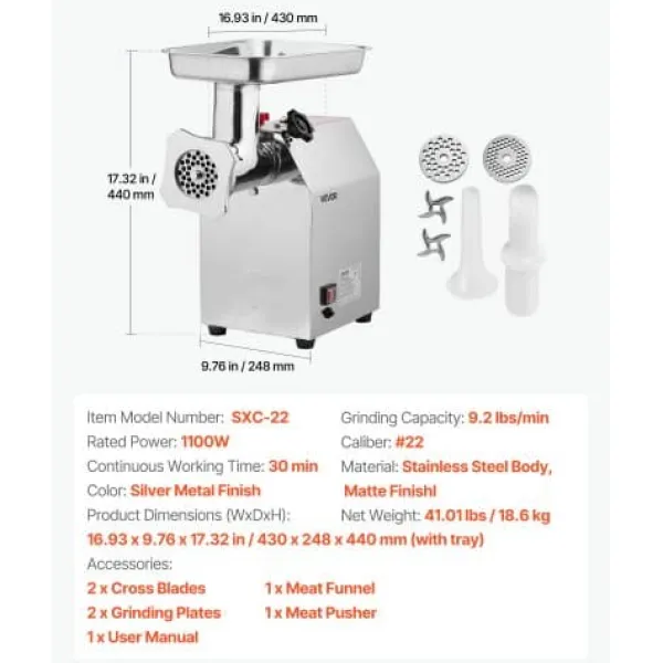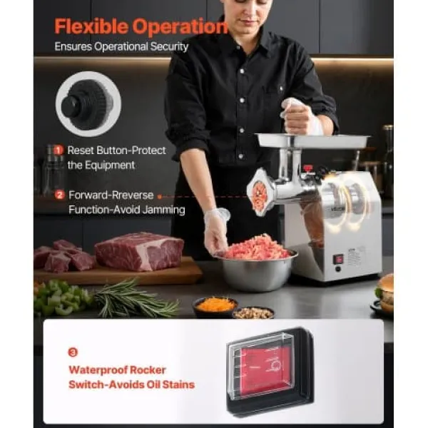 Denna kommersiella elektriska köttkvarn är utformad för högpresterande köttbearbetning i kök, restauranger och livsmedelsverksamheter. Med sin robusta konstruktion och mångsidiga tillbehör maler den enkelt olika typer av kött och kan även användas som korvtillverkare. De löstagbara delarna säkerställer enkel rengöring och underhåll efter intensiv användning.