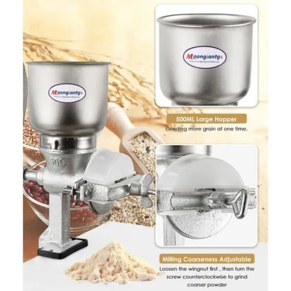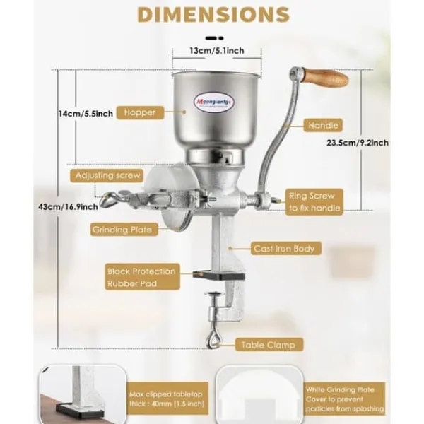 Denna manuella kornkvarn på 13 cm är idealisk för att mala olika korn som majs, kaffe och ris. Med sin justerbara malningsgrad kan den anpassa texturen efter dina behov. Tillverkad av gjutjärn är den utformad för enkel användning tack vare sin vev. Observera att den inte är lämplig för fuktiga korn.