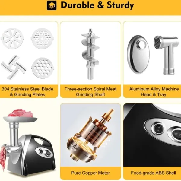 Med aluminiumlegerat kvarnhuvud och bricka, 304 rostfritt stålblad och malskivor samt ren kopparmotor kombineras korrosionsbeständighet och slitstyrka för lång livslängd.