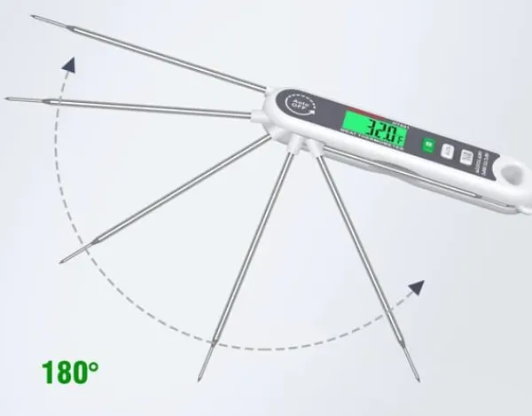 En trådlös termometer som låter dig mäta temperaturen exakt i en vinkel på upp till 180° tack vare möjligheten att justera sond. Indikerar temperaturen inuti köttet och den omgivande temperaturen i grader Celsius eller Fahrenheit.