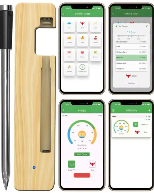 Med en Bluetooth-räckvidd på upp till 54 meter kan du enkelt övervaka tillagningen via AIBBQ Life-appen på din smartphone. Ställ in anpassade temperaturer eller välj förinstallerade inställningar för nötkött,