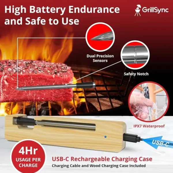 Termometern inkluderar en elegant USB-C-laddningsdocka i trä som ger 4 timmars användning efter bara 10 minuters laddning – inga batterier eller sladdar behövs. Sonden är tillverkad av rostfritt stål