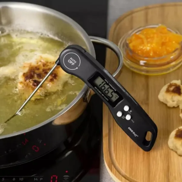 Den är idealisk i köket under matlagning för att kontrollera temperaturen på tillagad mat.