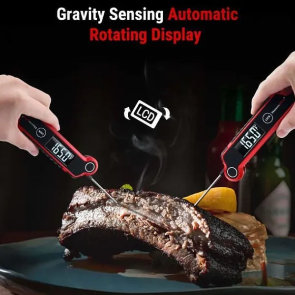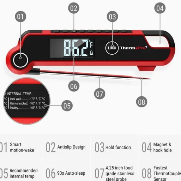 Kökstermometern Thermopro TP620 erbjuder en snabb avläsning på 2-3 sekunder med en noggrannhet på 0,9°F. Den har en bakgrundsbelyst LCD-skärm och en vattentålig design i IP65, vilket gör den lätt att använda. Med intelligent viloläge och låsning av avläsningar är den idealisk för perfekt och säker matlagning.