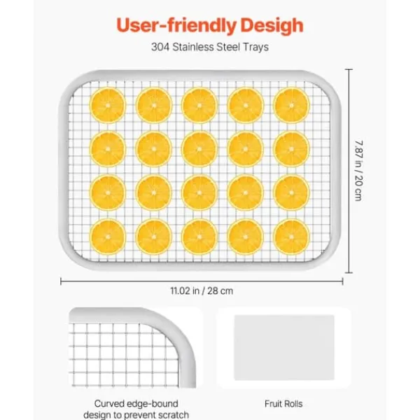 - Effektiv och Jämn Torkning: Denna uppgraderade mattorkningsmaskin är utrustad med ett förtjockat värmerör och en stor fläkt som genererar värme och cirkulerar den varma luften jämnt för att torka maten effektivt. Näringsämnena bevaras utan förlust, vilket garanterar en jämn torkning.
