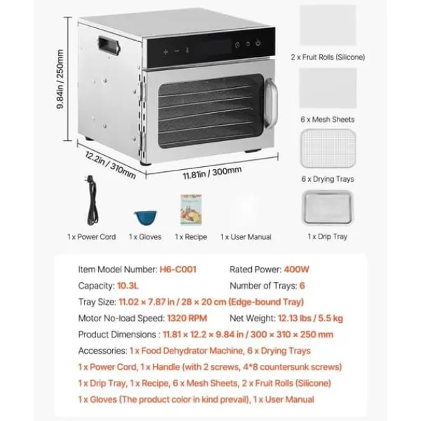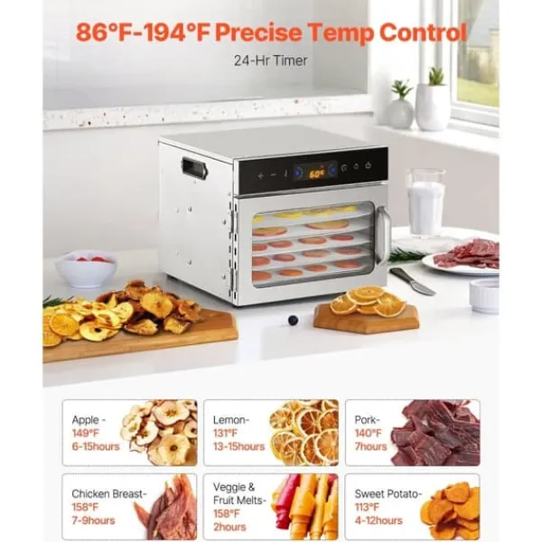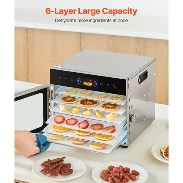 - 6-lagers Stor Kapacitet: Med möjlighet att hålla upp till sex lager mat samtidigt kan denna stora dehydrator torka stora mängder ingredienser på en gång. Den smarta digitala displayen och den justerbara temperaturen gör den enkel att använda för att torka olika livsmedel.