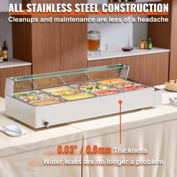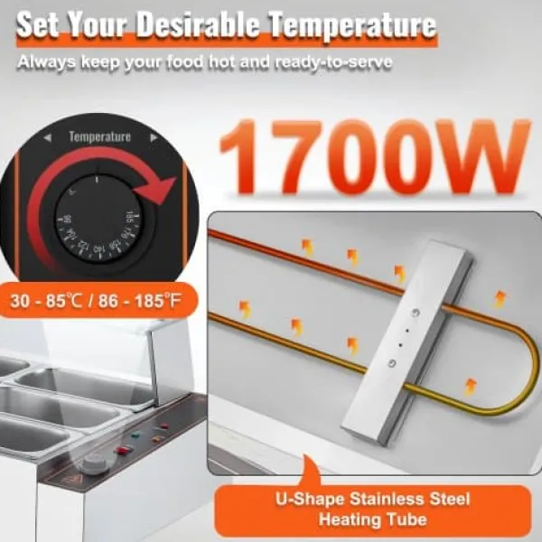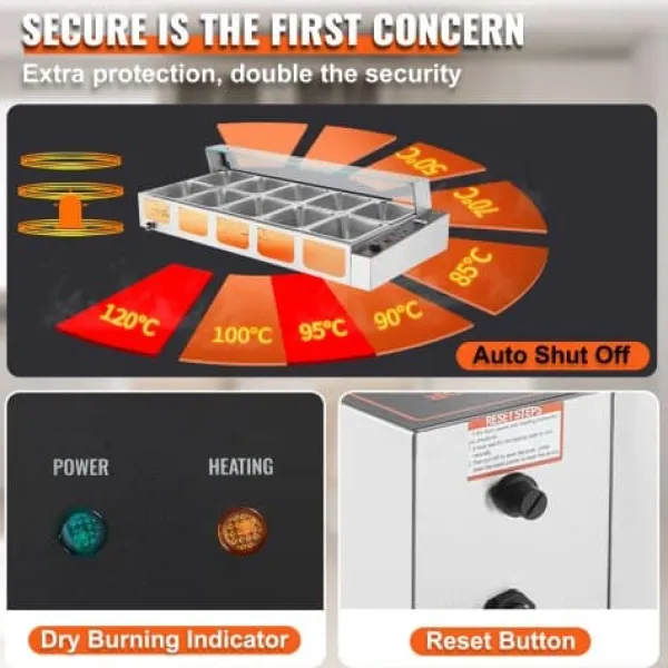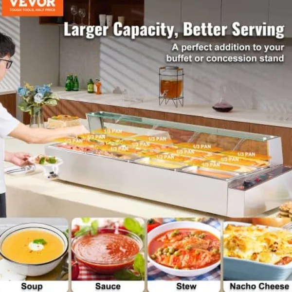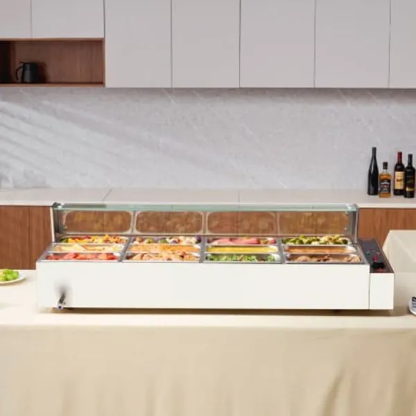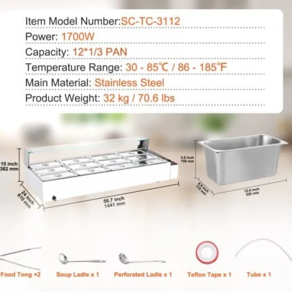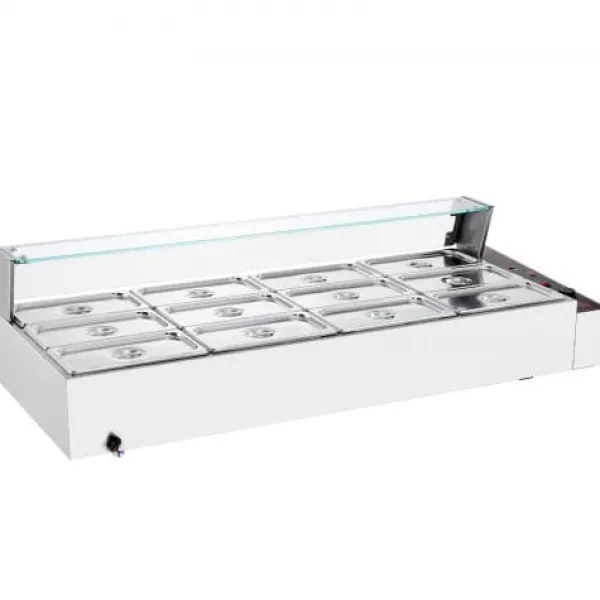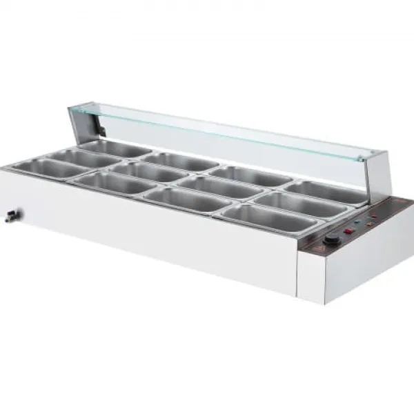Denna kommersiella matvärmare är utformad för catering och restaurangbruk, och erbjuder snabb och jämn uppvärmning för att hålla flera rätter vid perfekt serveringstemperatur. Den robusta konstruktionen i rostfritt stål säkerställer hållbarhet och enkel rengöring, medan användarvänliga funktioner som glastäckning, justerbar temperaturkontroll och torrkörningsskydd ger extra bekvämlighet och säkerhet. Med tolv medföljande kantiner och en rymlig bänkskivedesign är den idealisk för att servera olika maträtter samtidigt.