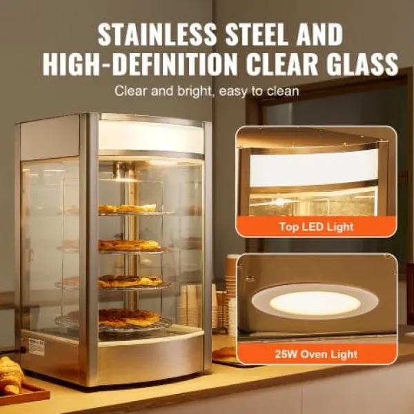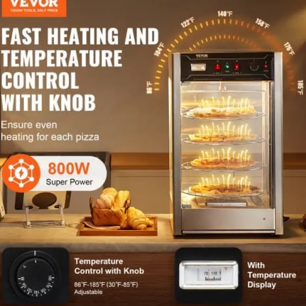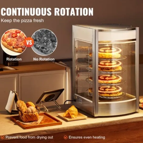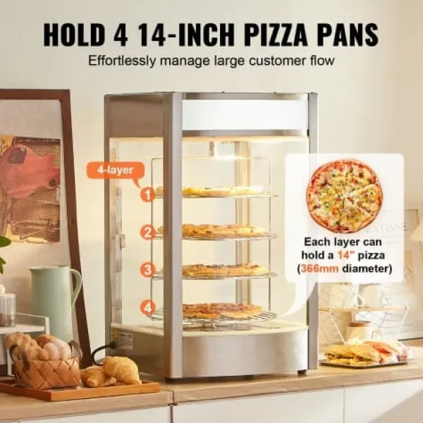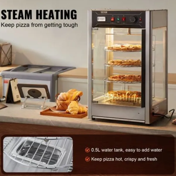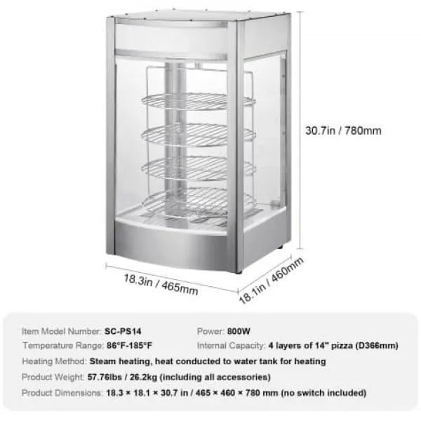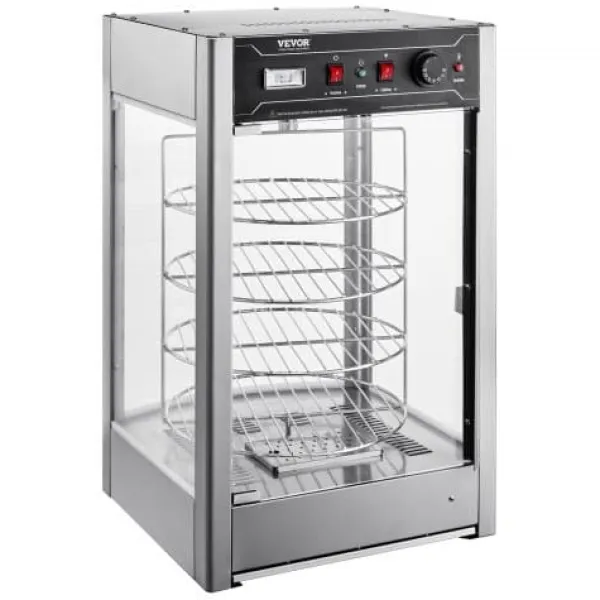 Denna kommersiella matvarmhållare är utformad för att hålla dina pizzor varma, färska och visuellt tilltalande, vilket gör den idealisk för pizzerior, restauranger och cafeterior. Med ett roterande ångvärmesystem och en rymlig fyrvåningsdesign säkerställs jämn uppvärmning och utmärkt matpresentation. Härdat glas och konstruktion i rostfritt stål ger hållbarhet och tydlig synlighet för dina produkter.