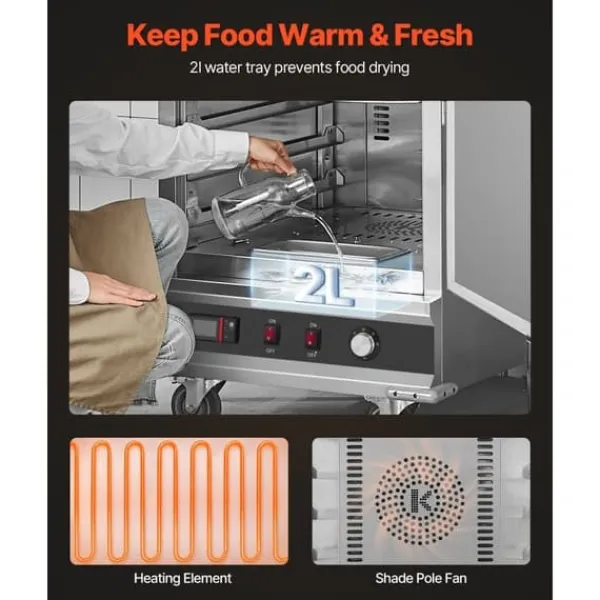 - Förhindrar uttorkning av mat: Värmeelement och skuggstångsfläkt för att hålla maten fräsch.