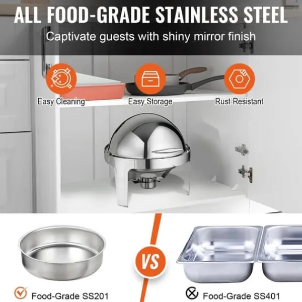 Livsmedelsklassat rostfritt stål: Vår buffématvärmare är tillverkad av högkvalitativt SS201 med högblank yta, designad för daglig användning och erbjuder en modern look som passar in i din klassiska inredning. Dessutom är den lätt att underhålla och rengöra.