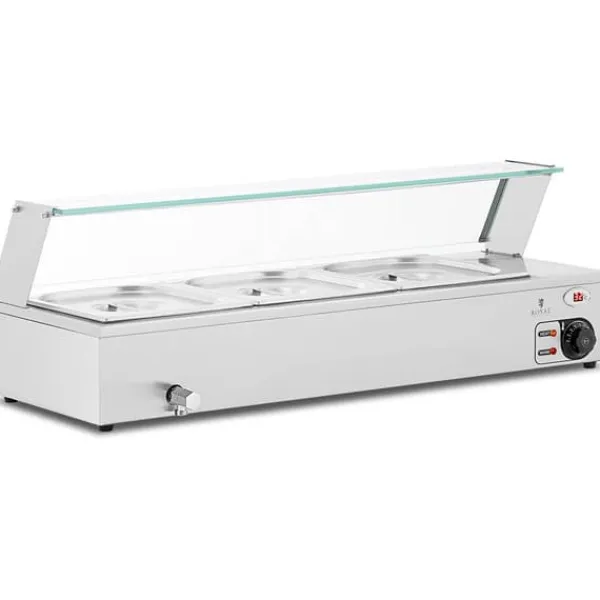 Denna bain marie från Royal Catering är perfekt för att hålla olika rätter varma under en längre tid. I 3 st. gastronormbehållare kan alla komponenter i en maträtt eller flera rätter som kött, fisk, grönsaker, ris, potatis och sås hållas vid önskad temperatur utan att brännas vid. Vattenbadet täcker optimalt exklusiva cateringbehov och är lämplig för användning i restauranger, hotell, matsalar, bufféer, snackbarer, kafeterior eller äldreboenden och kliniker.