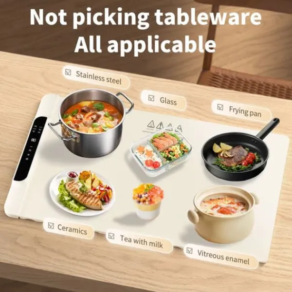 4. Olika tillfällen: Denna elektriska värmebricka är lämplig för olika material av köksredskap, såsom glas, rostfritt stål och keramik. Denna version har uppgraderats till en större storlek jämfört med traditionell uppvärmningsmatta för mat. Det är perfekt för stora familjemöten, festligheter eller sociala middagar med vänner.