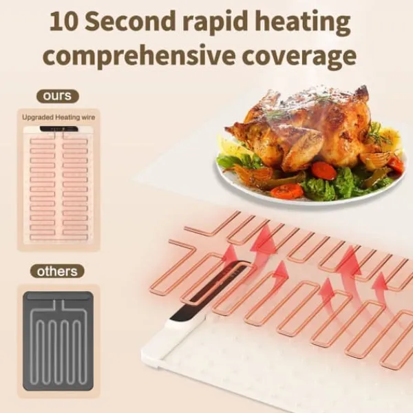 1.Fast Full-Surface Heating: Vår matvärmematta används premium silikonmaterial, genomtänkt utformad värmetråd kan snabbt och jämnt värma hela ytan, vilket säkerställer att din mat når den idealiska temperaturen på kort tid. Njut av god mat omedelbart utan att vänta.