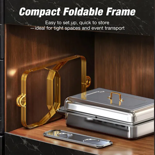 Dessa rektangulära varmhållningsskålar för buffé är byggda med en förtjockad, hopfällbar ram och erbjuder förbättrat stöd och stabilitet för tyngre mat. Den hopfällbara designen gör förvaring och transport enklare för mobil inomhus- och utomhuscatering, fester och trånga kök.