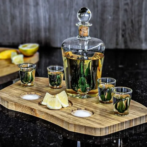 Detta Tequila Decanter Set är en handgjord karaff som är en hyllning till agaveväxten. I mitten av karaffen och shotglasen finns en agaveplanta, som är grundingrediensen i tequila. I detta lyxiga set ingår en karaff med korkpropp för att säkerställa en lufttät försegling. Karaffen rymmer 840 ml och är tillverkad av kristallklart glas som är lättviktigt och hållbart. Setet innehåller också en serveringsplatta av högkvalitativ bambu, som är graverad för att vila karaffsetet och utrymme för servering av salt och citron.