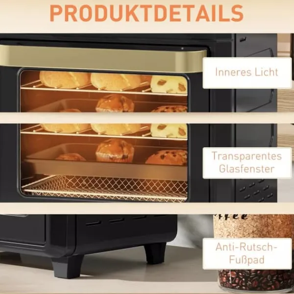 - ✔ Med 360º varmluftscirkulation minskar miniugnen med varmluft oljeanvändningen med 85 %, för hälsosammare måltider