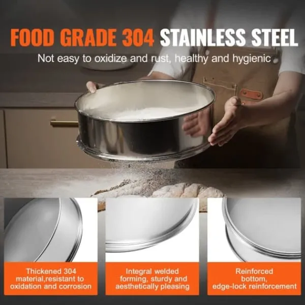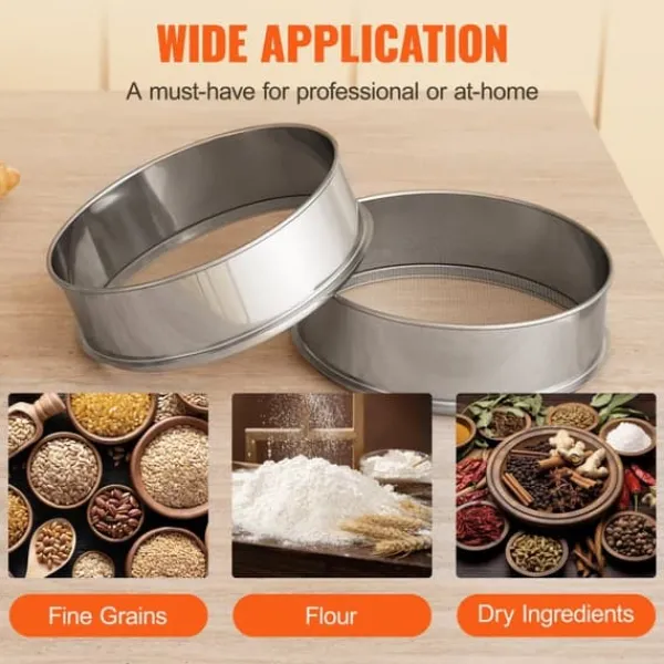 Används i stor utsträckning i restauranger, bagerier, mjölkvarnar, hemmakök, etc., idealisk för att sikta och filtrera föroreningar och klumpar från torra ingredienser som mjöl, socker och kryddor, såväl som för spannmål som bönor, ris och pasta.
