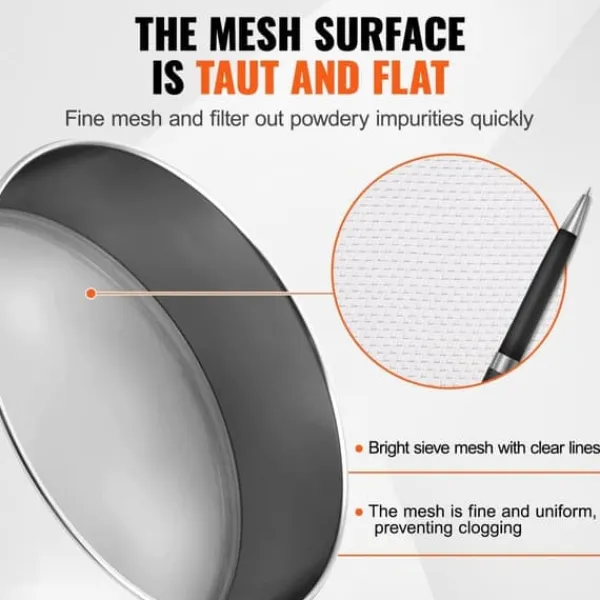 Sållnätet är tillverkat av livsmedelsklassat rostfritt stål SUS304, känt för sin robusta och hållbara textur som är resistent mot deformation. Den erbjuder utmärkta vattentäta och korrosionsbeständiga egenskaper, vilket säkerställer hälsa och hygien. Den kan användas självständigt för dagliga enkla uppgifter eller effektivt installeras på vår vibrerande sållshaker.