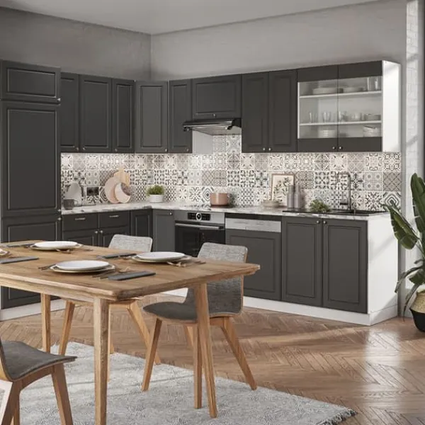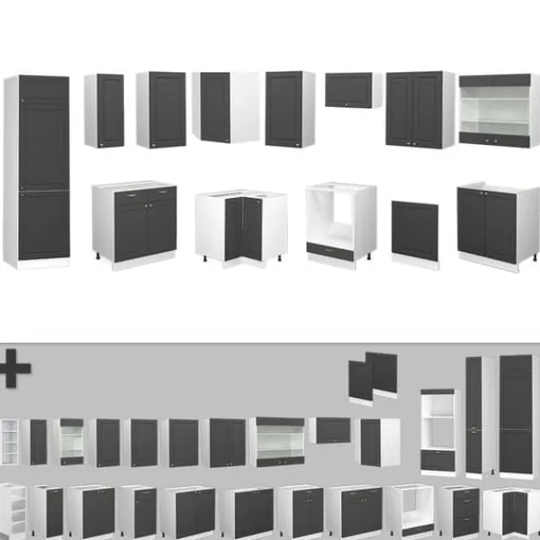 MATERIAL: Det modulära hörnköket är tillverkat av lättskött 16 mm spånskiva, belagd med melaminharts. Alla fronter på köksenheterna är gjorda av högkvalitativ MDF.