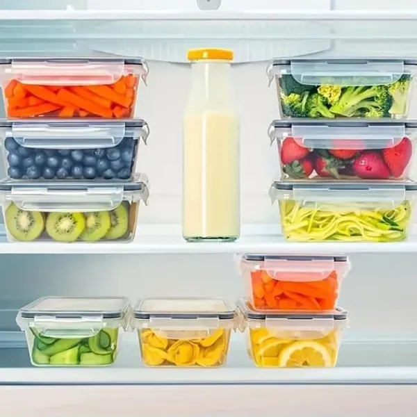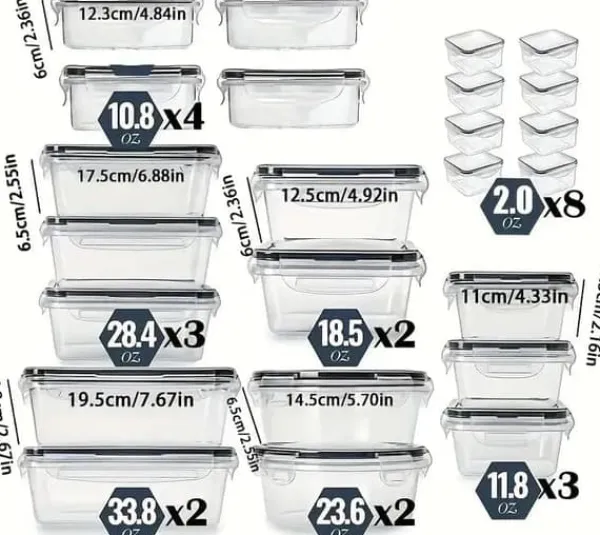 De klara behållarna är stapelbara och kan enkelt placeras i kylskåp eller skåp för att spara utrymme och samtidigt ge tydlig överblick av innehållet.