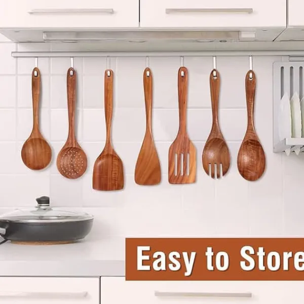 Träredskapen är non-stick, enkla att rengöra för hand med varmt vatten. Varje del har ett upphängningshål – häng upp eller placera i hållaren för snabb och smidig förvaring.