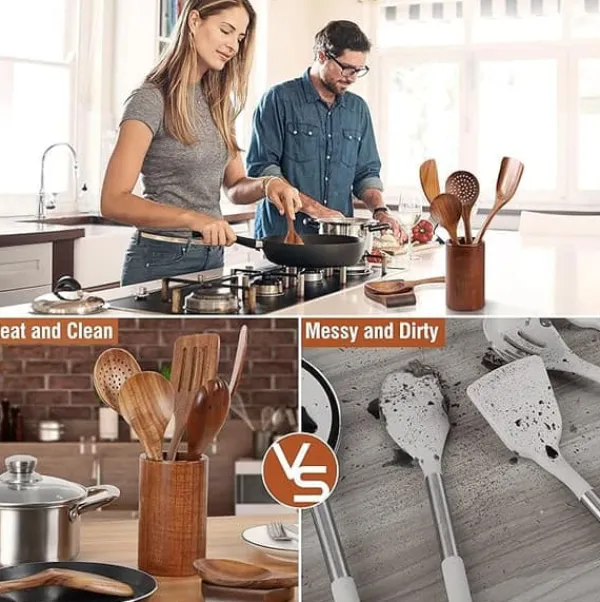 Tillverkat av naturligt massivt teakträ, känt för sin höga täthet, hårdhet och motståndskraft mot sprickor. Teak är mer hållbart än bambu eller silikon. Alla redskap är handslipade för en slät yta som inte skadar dina kastruller eller stekpannor.