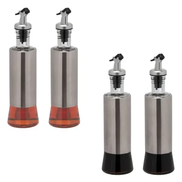 Silverfärgade oljedispensrar, set om 4. Denna uppsättning med fyra vinäger- och oljedispensrar gör det enkelt att krydda vid bordet. Pipen gör att du kan fördela olivolja eller vinäger jämnt över sallader, förrätter eller huvudrätter. 300 ml-dispensrarna är också oumbärliga under tillagningen. Fyll de fyra moderna glasflaskorna med matolja eller vin efter behov. Detta gör att du kan förfina rätter medan du lagar mat, bakar eller grillar. Denna uppsättning olje- och vinägerflaskor är ett måste för alla matbord.