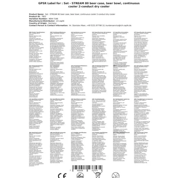 Underräknare komplett set – Öltapp – STREAM 80 ölväska, genomströmningskylare, 2-rads torrkylare Bestående av: •STREAM 80 ölväska, genomströmningskylare, 2-rads torrkylare•Anslutningar: John Guest•1x dispenser / pumpmodell, mattborstad, dubbelsidig•2 x ölslang 7mm komplett, klar, 3,0 m•2 x rengöringsadapter 30 mm•1 x tryckreducerande 2-sidig CO2 för ölutmatare 3bar•1 x CO2-flaska, 2,0 kg•2 x CO2-slang komplett, 1,5 m•2 x ölslang John Guest – 3/8 och 5/8 skruvkontakt 2,00 m – helt färdig!•Koldioxidnyckel captive•2 x dispenseringshuvud, ditt val: utan, platt, kombi, korg, Köpi Öltapp – STREAM 80 ölväska, genomströmningskylare, 2-rads torrkylare 3 minuter att packa upp… 2 minuter att ställa upp… 1 minut att ansluta = oändligt njutande.En kall, klar, nyligen tappad öl – du har förtjänat det!Ölkylaren STREAM 80 2lt är avsedd för professionell kylning och serveringav utmärkt kyld öl i hemmiljö, på trädgårdsfesteroch för medelstora kommersiella användningar. •Reglerområde+2 till +10 grader•Prestanda:90 liter/h vid 10°C TD•Kylteknologiär 45% mer effektiv•Klar att användapå endast 5-10 minuter När termostaten ställs på Max,kommer termoblocket (efter ca 10 minuter) att ackumulera en hög mängdenergi, vilket möjliggör serveringav flera kylda öl i följd.Kylteknologin för STREAM 80 Öltapp är cirka 45% mer effektiv än den elektriska energiförbrukningen.Ölet kyls ner till kranen.Kylöglorna är tillverkade av rostfritt stål och är därför stabila och hållbara. De använda materialen uppfyller de högsta hygienstandarderna och möjliggör en lång livslängd för kylaren. STREAM 80 2lt – och den kalla ölen strömmar från 2 kranar Med sin starka kylprestanda och perfekta dimensioner tillhör ölkylaren STREAM 80 de ledande 2-linjiga bords-/underbordskylarna på marknaden. Kylprestanda från 170 till 180 glas (0,5 liter) utmärkt kyld öl per timme, Den kraftfulla kompressorn STREAM 80 säkerställer en minimal energiförbrukning och en utmärkt kyld öl utan att skumma Genomströmningskylare STREAM 80 2ltg. – Effektivitet, Prestanda, Njutning Termoblocket för ölkylaren STREAM 80 har hög energikapacitet, vilket gör att en perfekt kyld öl kan serveras redan efter 5-10 minuter. När termostaten ställs på Max, kommer termoblocket (efter ca 10 minuter) att ackumulera en hög mängd energi, vilket möjliggör servering av flera kylda öl i följd. Kylteknologin för STREAM 80 Öltapp är cirka 45% mer effektiv än den elektriska energiförbrukningen. Ölet kyls ner till kranen. Kylöglorna är tillverkade av rostfritt stål och är därför stabila och hållbara. De använda materialen uppfyller de högsta hygienstandarderna och möjliggör en lång livslängd för kylaren. Genomströmningskylare STREAM 80 – Tekniska Specifikationer Den eleganta STREAM 80 Torrkylaren med en vikt på endast 45 kg är utrustad med en 7 mm ledning. •Mått:(BxDxH) 255х635х510 mm (inklusive droppbricka)•Strömspänning: 220V, 50 Hz, 764W, 4,3A•Kompressor: 3/8 PS•Linjer: 2 x ölsorter•Hölje: Metall, pulverlackerad, rostsäker Hög kvalitet på utförandet och förpackningen STREAM 80 – Bäst i klassen för 2-linjiga zapfanläggningar Ölkylaren STREAM 80 är i kategorin Öltapp upp till 90 l/h, en av de bästa när det gäller förhållandet mellan kostnad,prestanda och kvalitet. Enkel rengöring av STREAM 80 Med följande rengöringsset kan du enkelt och bekvämt rengöra ölkylaren STREAM 80 efter användning: Rengöringsset litet Lättrengöringsset (rekommenderas) Städningsset stort Öltapp STREAM 80 – Bierkoffer, Genomströmningskylare med 2 linjer, Torrkylare, upp till 60 liter/h Det är bara att tappa några öl: Packa upp zapfanläggningen Anslut tryckregulatorn till CO2-flaskan med kolsyre-nyckeln och dra åt Anslut CO2-slangen från tryckregulatorn till tapphuvudet Anslut ölslangen till tapphuvudet och sätt in och fixera i zapfanläggningen Tappa fatet Justera tapptrycket på tryckregulatorn Anslut zapfanläggningen till eluttaget Justera trycket och njut av en kall öl
