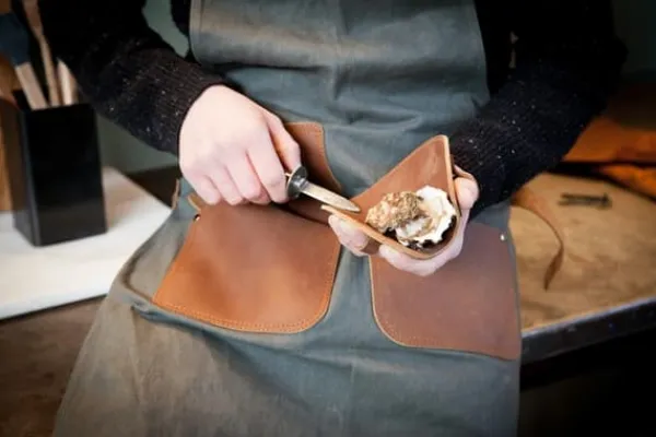En exklusiv ostronkniv med handskydd i buffelläder för skaldjursälskare. Den har en ring som skyddar mot kniven, samt ett bekvämt handskydd i (buffel) läder.Vi älskar denna produkt som skyddar handen när vi öppnar ostron. Enkelt, snyggt och effektivt!