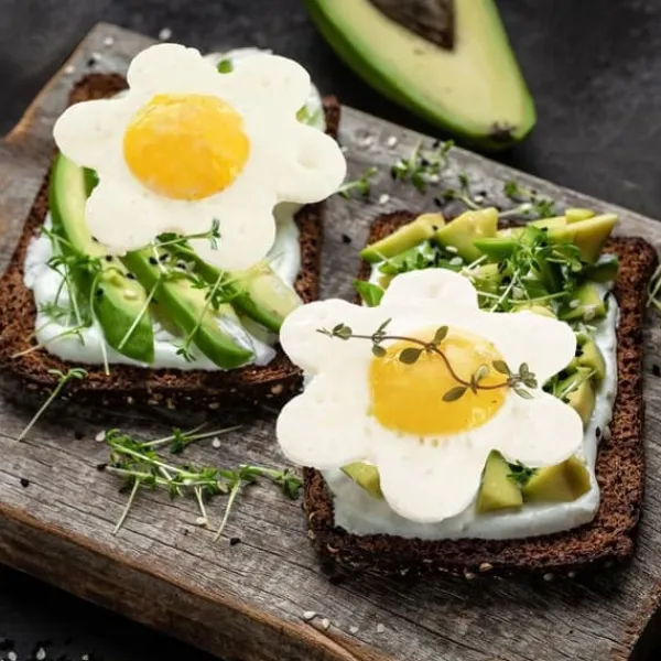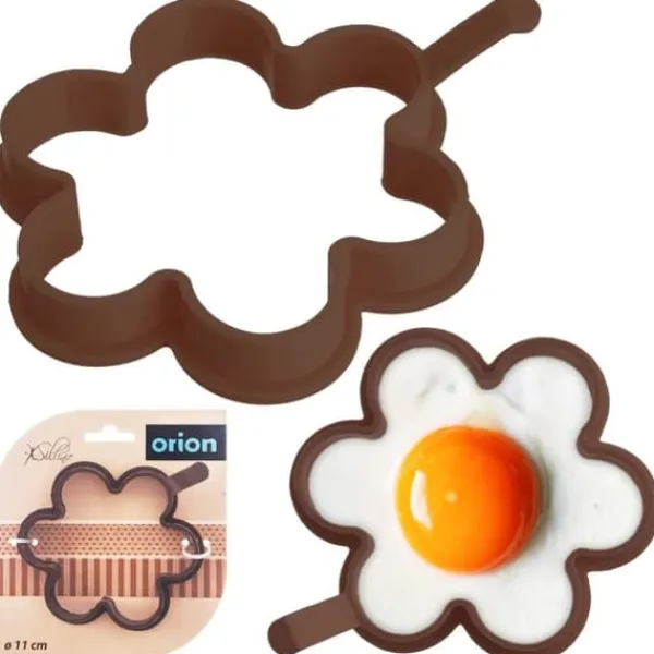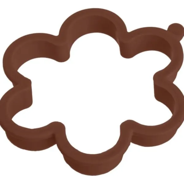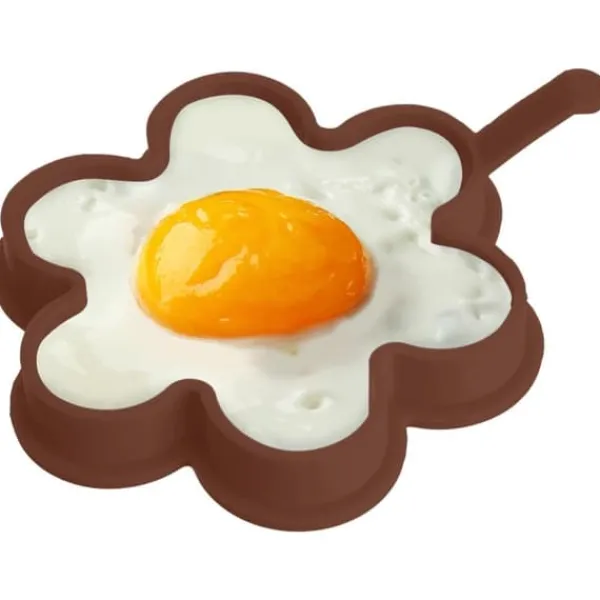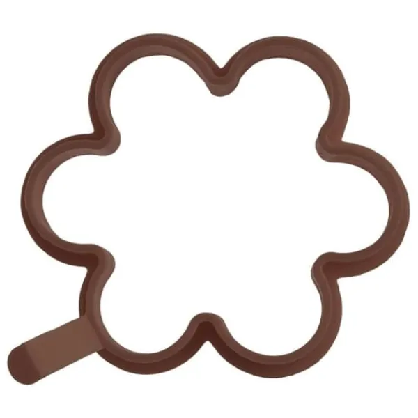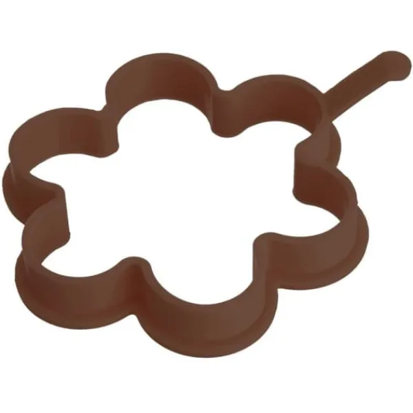 Brun silikonblomformad äggform för stekta ägg eller pannkakor. Formen har ett handtag för enkel hantering. Ägg och smet fastnar inte, och de är lätta att ta bort.