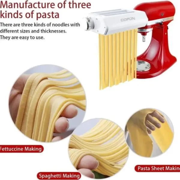 Cofun 3-i-1-tillbehöret för KitchenAid köksmaskin är tillverkat av livsmedelsklassad aluminium. Det gör det enkelt att förbereda hälsosamma degar och nudlar. Praktiskt och enkelt att rengöra, är detta tillbehör ett måste för dina pastarecept.
